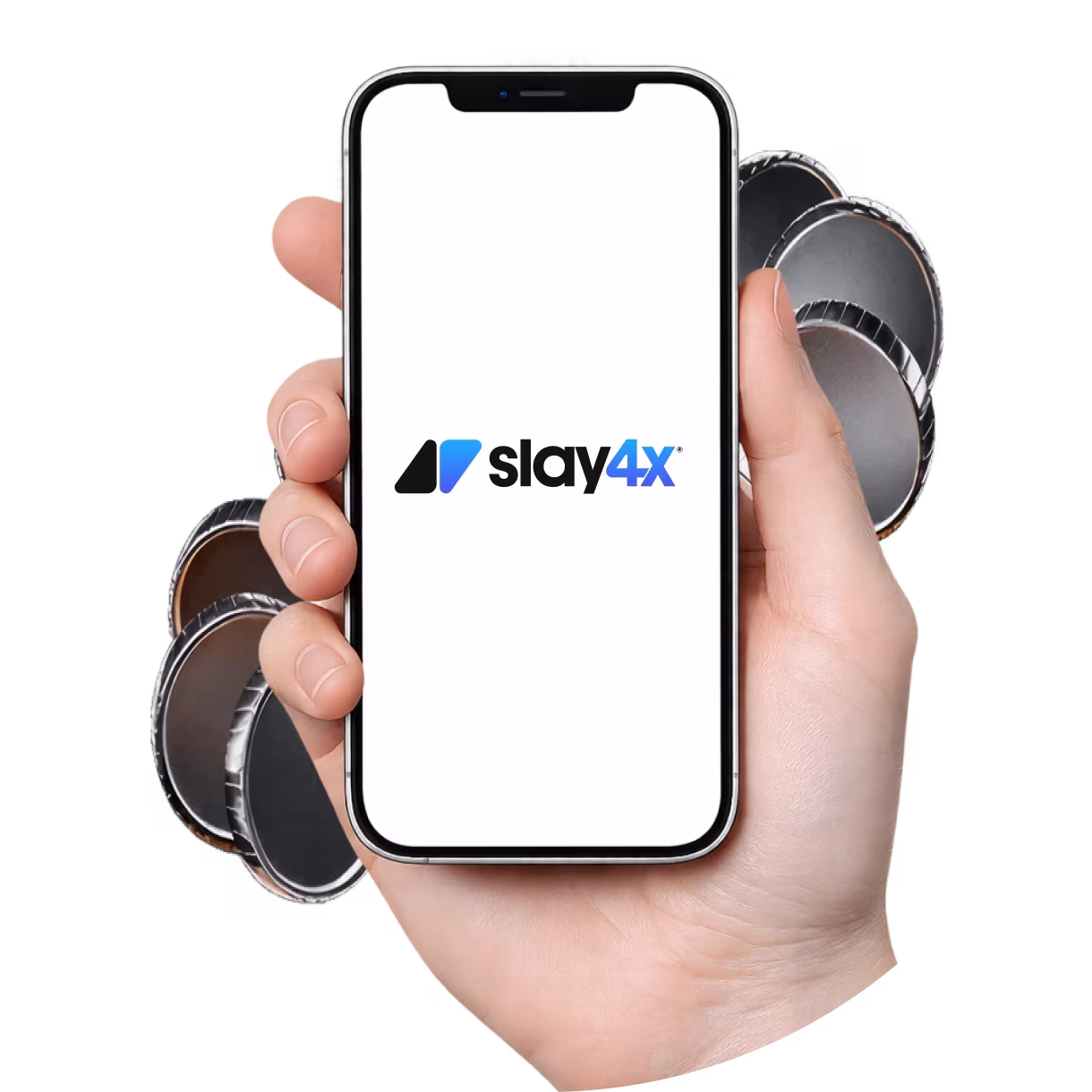 Slay4X mobile app preview with phone and coins
